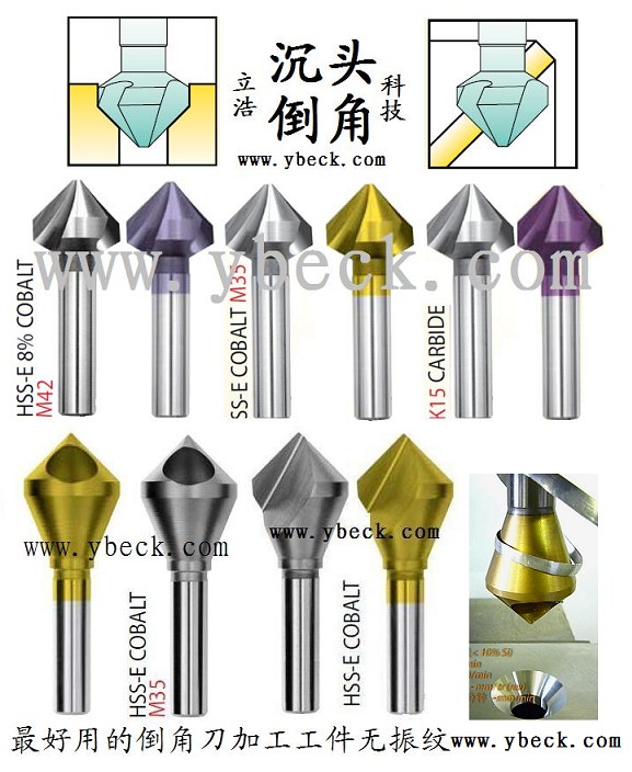 锪钻 倒角刀;度数有|45度 90度 82度 120度60度(三齿)三刃 直柄,(单齿) 单刃 深沟槽 大排泄。刀锋更锋利。 很好的排屑 加工沉头 孔以及去毛刺。倒角和锪钻使加工物件表面光滑通顺,排屑顺畅、导向功能平滑,在切削时加入润滑油,可更能体现他的锋利度。不会出现被切勿体出现肌瘤。倒角刀(倒角器)锪钻。表面处理有涂层和不涂层,(两款可选用)表面氮化钛涂层;耐磨;使用寿命长,切削速快 切削速度可调(等可调式更高速度)可分为,莫氏锥柄和直柄; 特别适合钻削HSSE模具钢、不锈钢、45号钢及软材质的有色金属的沉头加工;可选择国产的和进口的 ;白钢高速钢 含钴高速钢 钨钢焊刃 钨钢整体 白钢整体。等多款选择。有需要敬请联系立浩数控销售电话0769-85326285