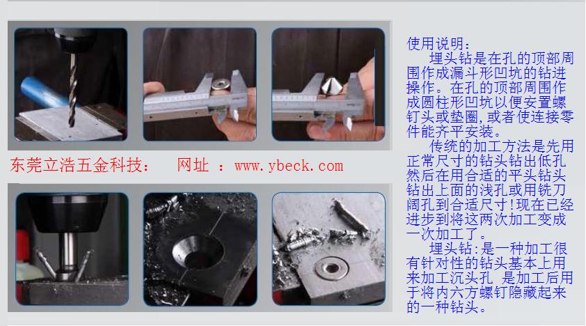 德国贝克埋头钻原装进口。埋头钻是在孔的顶部周围作成漏斗形凹坑的钻进操作。在孔的顶部周围作成圆柱形凹坑以便安置螺钉头或垫圈,或者使连接零件能齐平安装。传统的加工方法是先用正常尺寸的钻头钻出低孔然后在用合适的平头钻头钻出上面的浅孔或用铣刀阔孔到合适尺寸!现在已经进步到将这两次加工变成一次加工了。埋头钻:是一种加工很有针对性的钻头基本上用来加工沉头孔 是加工后用于将内六方螺钉隐藏起来的一种钻头。