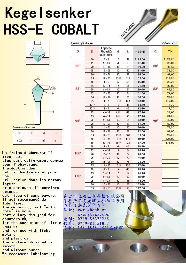 圆孔倒角-圆孔倒角刀CNC加工专用刀具。,上档次。规格齐全。圆柱柄 -公制规格:规格全。刃口锋利;单孔确保排屑顺畅,快速,防止堵塞工件;大前角利于高效切削;锥面上具有连续后角,易于重磨刃口;切削热低,加工平稳;加工的表面光洁无括痕;使用陶瓷砂轮磨头修磨孔口即可重磨刀 刃,简易方便;特别适用于有色金属、轻金属和塑料去毛剌及轻微倒角加工.